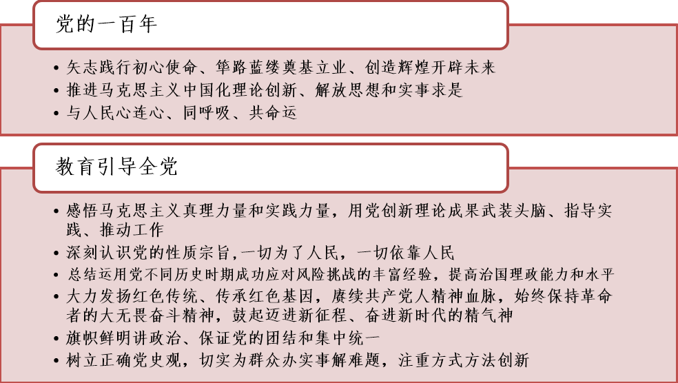 本次活动学习了《讲好习近平新时代中国特色社会主义思想需要把握的几个着力点》(张帆)、《习近平新时代中国特色社会主义思想的基本内容和历史意义》(李后东)、《中国共产党的百年历程和宝贵经验》(王晓荣)、《中国共产党一百年自我革命的历史逻辑——全面从严治党的历史演进与重大成就》(王彦军)四个专题报告。学习之后,普适支部组织集中研讨,将相关内容落实到课程思政教育和支部党课活动中,做到知行合一、学以致用。