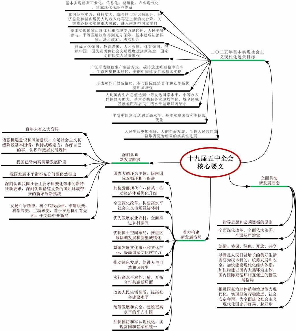 2020年10月29日,中国共产党第十九届中央委员会第五次全体会议胜利闭幕。这次会议是在国际局势发生深刻变化、我国进入新发展阶段之际召开的重要会议。着眼未来,习近平总书记要求以辩证思维看待新发展阶段的新机遇新挑战,要“准确识变、科学应变、主动求变,勇于开顶风船,善于转危为机,努力实现更高质量、更有效率、更加公平、更可持续、更为安全的发展。” 全会就“十四五”时期经济社会发展主要目标做出12方面部署,坚持以人民为中心,坚持创新在我国现代化建设全局中的核心地位,坚定不移贯彻创新、协调、绿色、开放、共享的新发展理念,……,习近平总书记将其高度概括总结为三个“新”要求:深刻认识新发展阶段,全面贯彻新发展理念,着力构建新发展格局。全会提出了到二〇三五年基本实现社会主义现代化远景目标,这就是:我国经济实力、科技实力、综合国力将大幅跃升,经济总量和城乡居民人均收入将再迈上新的大台阶,关键核心技术实现重大突破,进入创新型国家前列;基本实现新型工业化、信息化、城镇化、农业现代化,建成现代化经济体系;基本实现国家治理体系和治理能力现代化,人民平等参与、平等发展权利得到充分保障,基本建成法治国家、法治政府、法治社会;建成文化强国、教育强国、人才强国、体育强国、健康中国,国民素质和社会文明程度达到新高度,国家文化软实力显著增强;广泛形成绿色生产生活方式,碳排放达峰后稳中有降,生态环境根本好转,美丽中国建设目标基本实现;形成对外开放新格局,参与国际经济合作和竞争新优势明显增强;人均国内生产总值达到中等发达国家水平,中等收入群体显著扩大,基本公共服务实现均等化,城乡区域发展差距和居民生活水平差距显著缩小;平安中国建设达到更高水平,基本实现国防和军队现代化;人民生活更加美好,人的全面发展、全体人民共同富裕取得更为明显的实质性进展。
